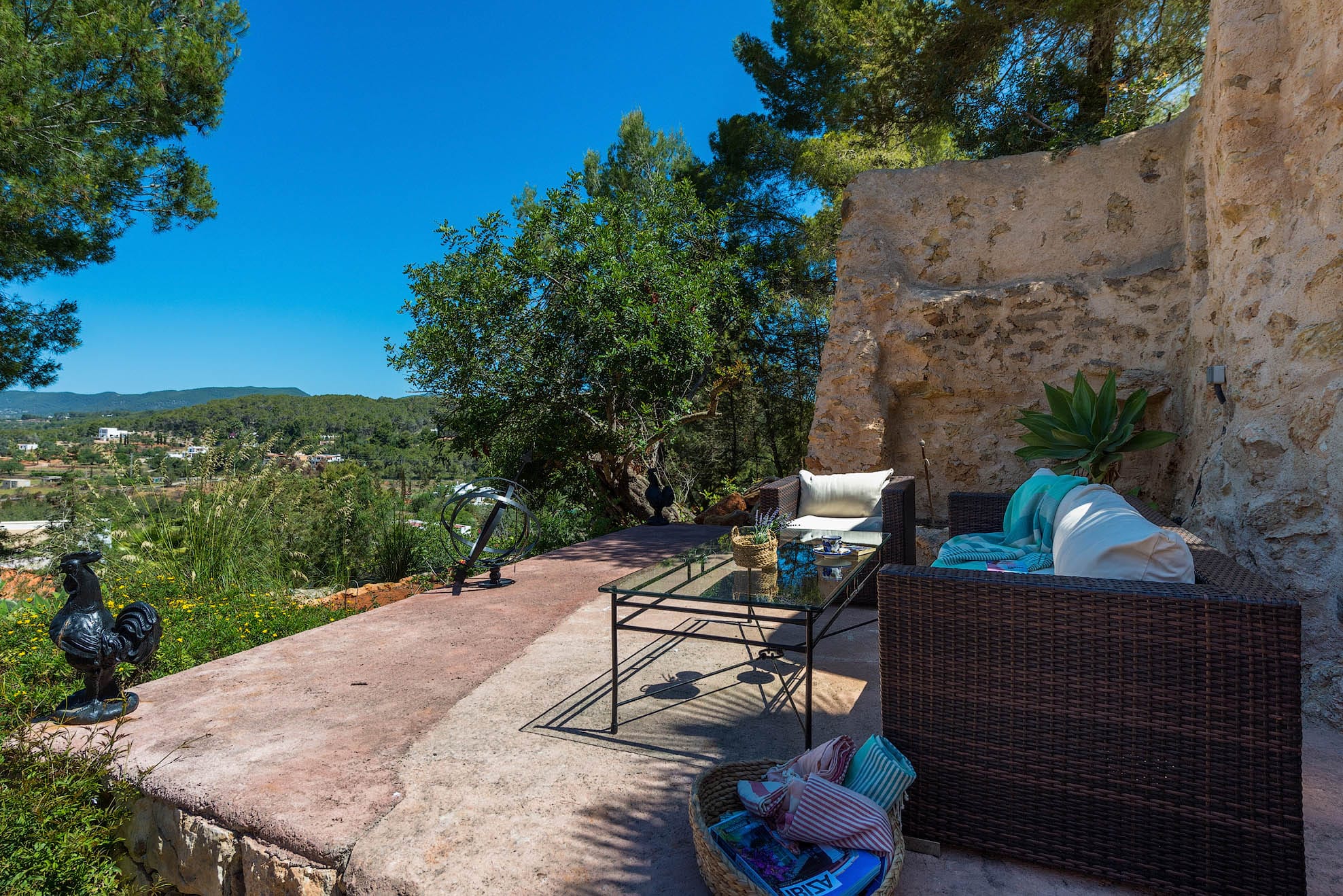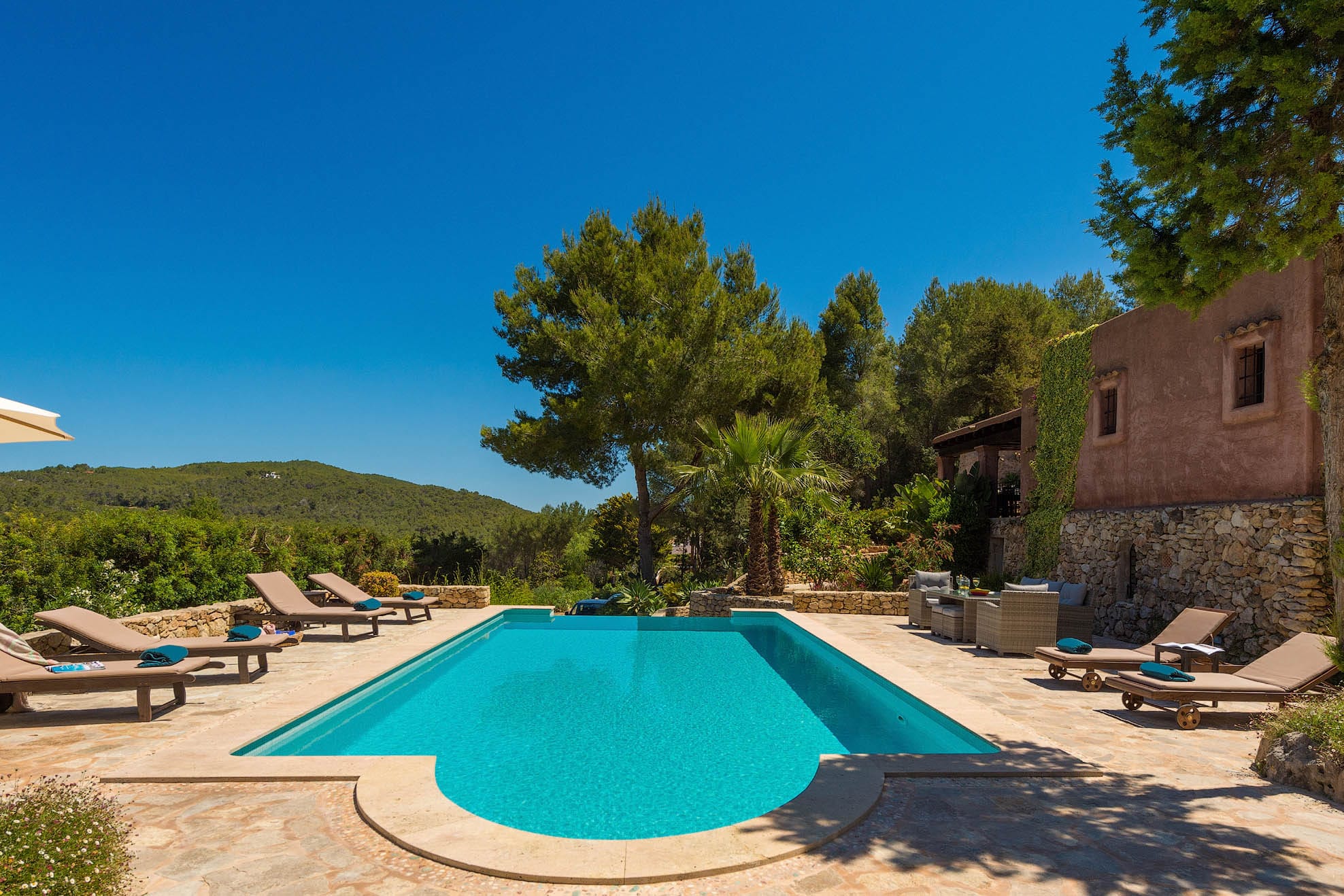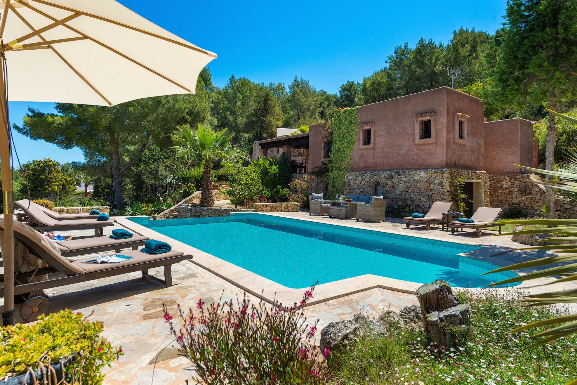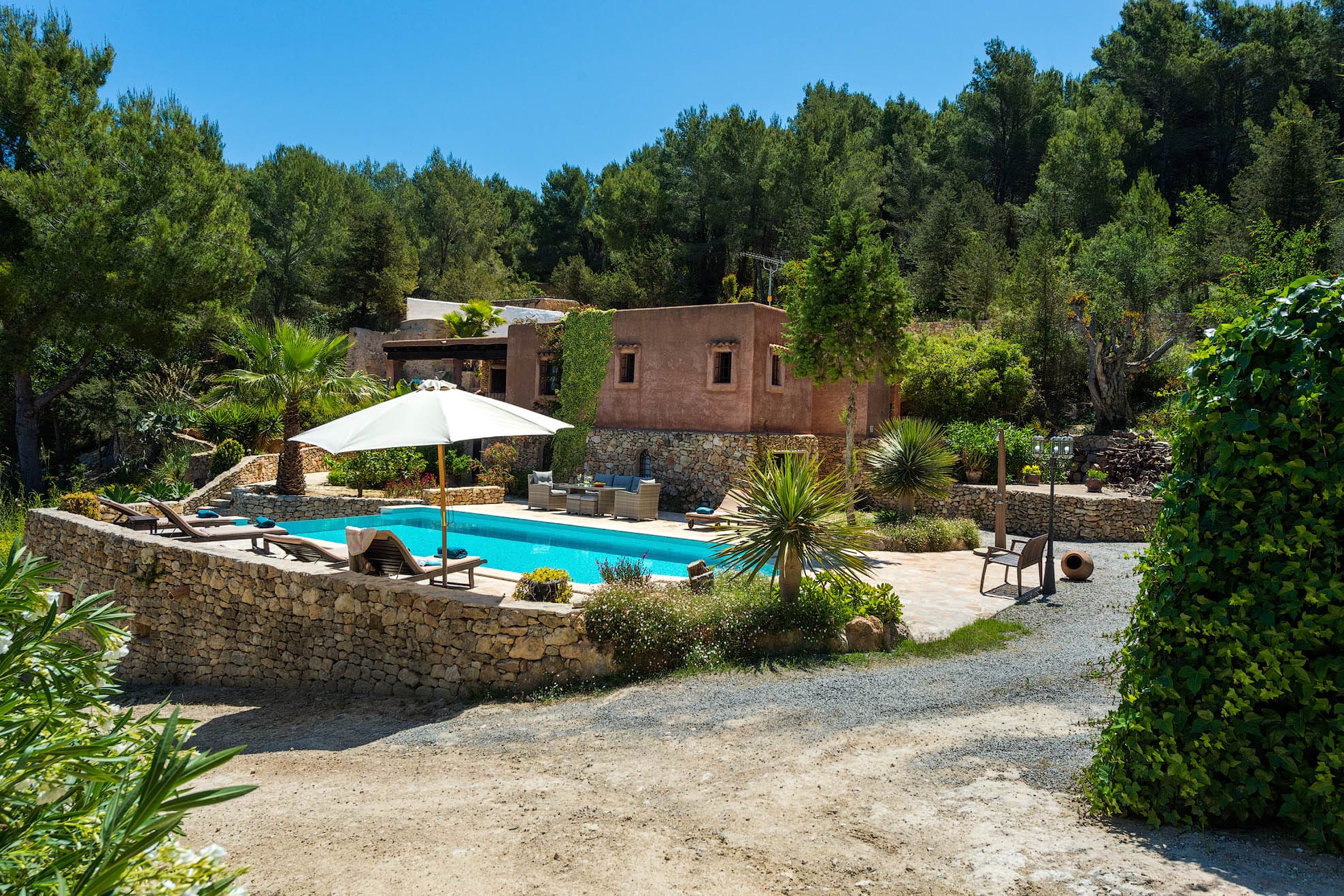 Located on a hill, with plenty of sunlight and surrounded by trees, this pretty traditional Ibiza style house with a lovely garden and pool area.