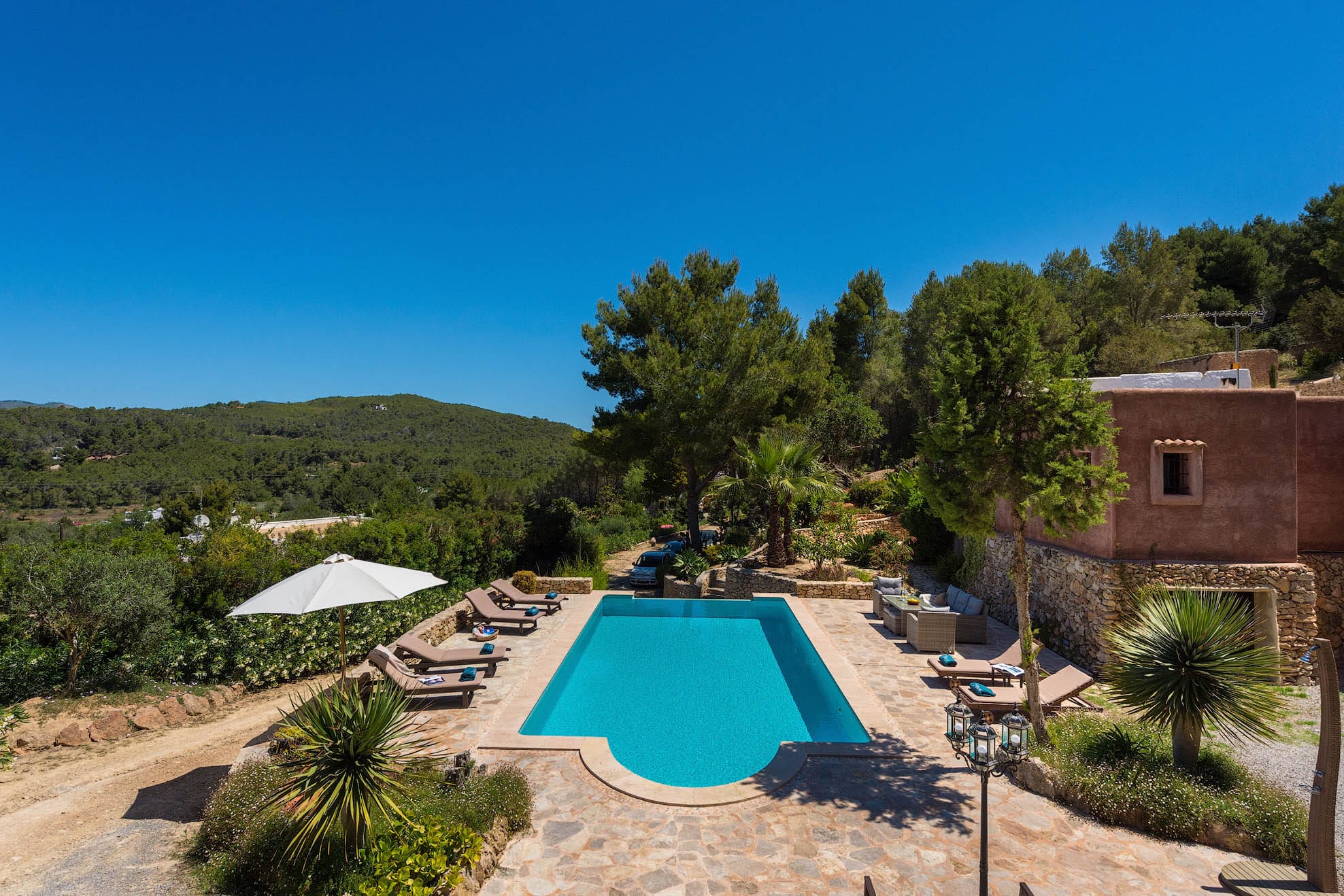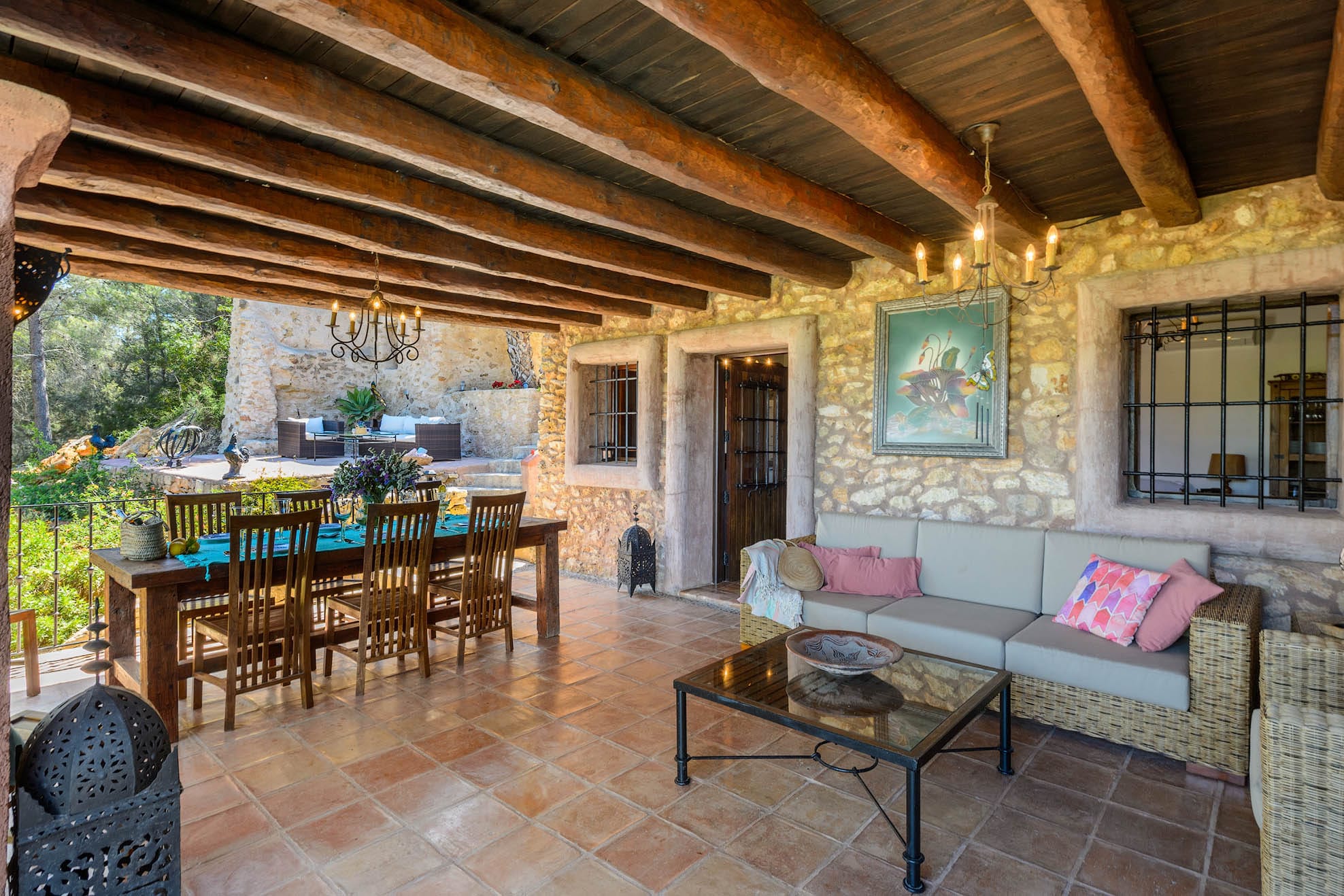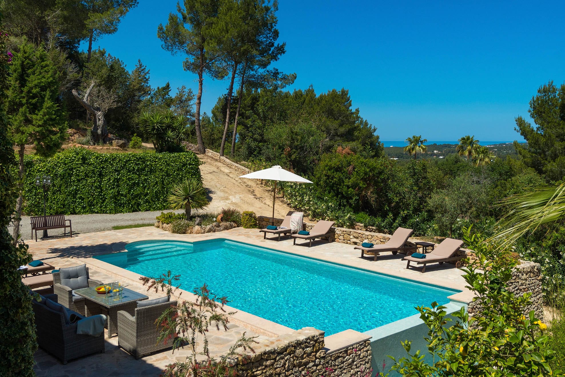 Located on a hill, with plenty of sunlight and surrounded by trees, this pretty traditional Ibiza style house with a lovely garden and pool area.