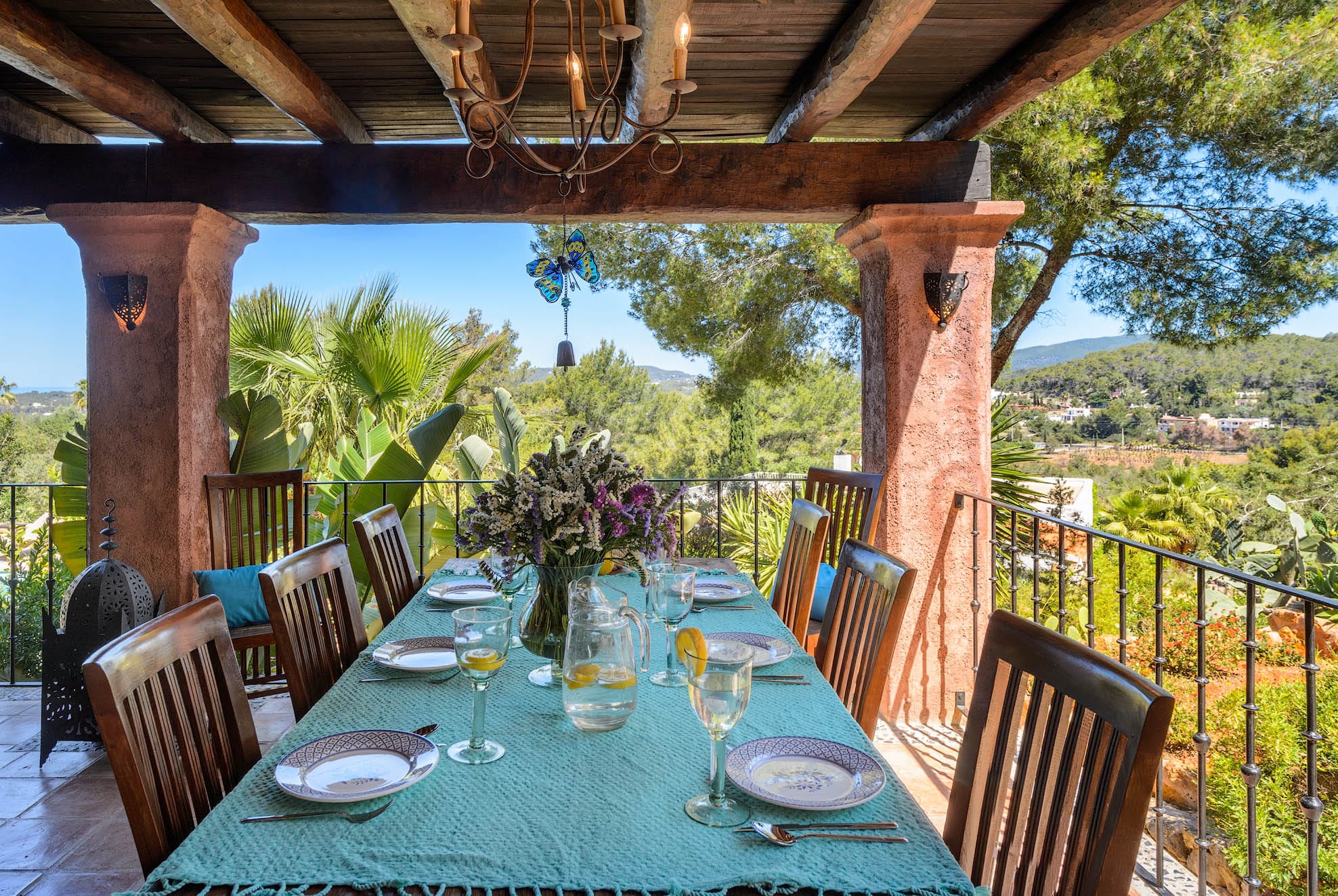 A spacious porch with a dining table and sofa that overlooks the valley and the sea beyond.
