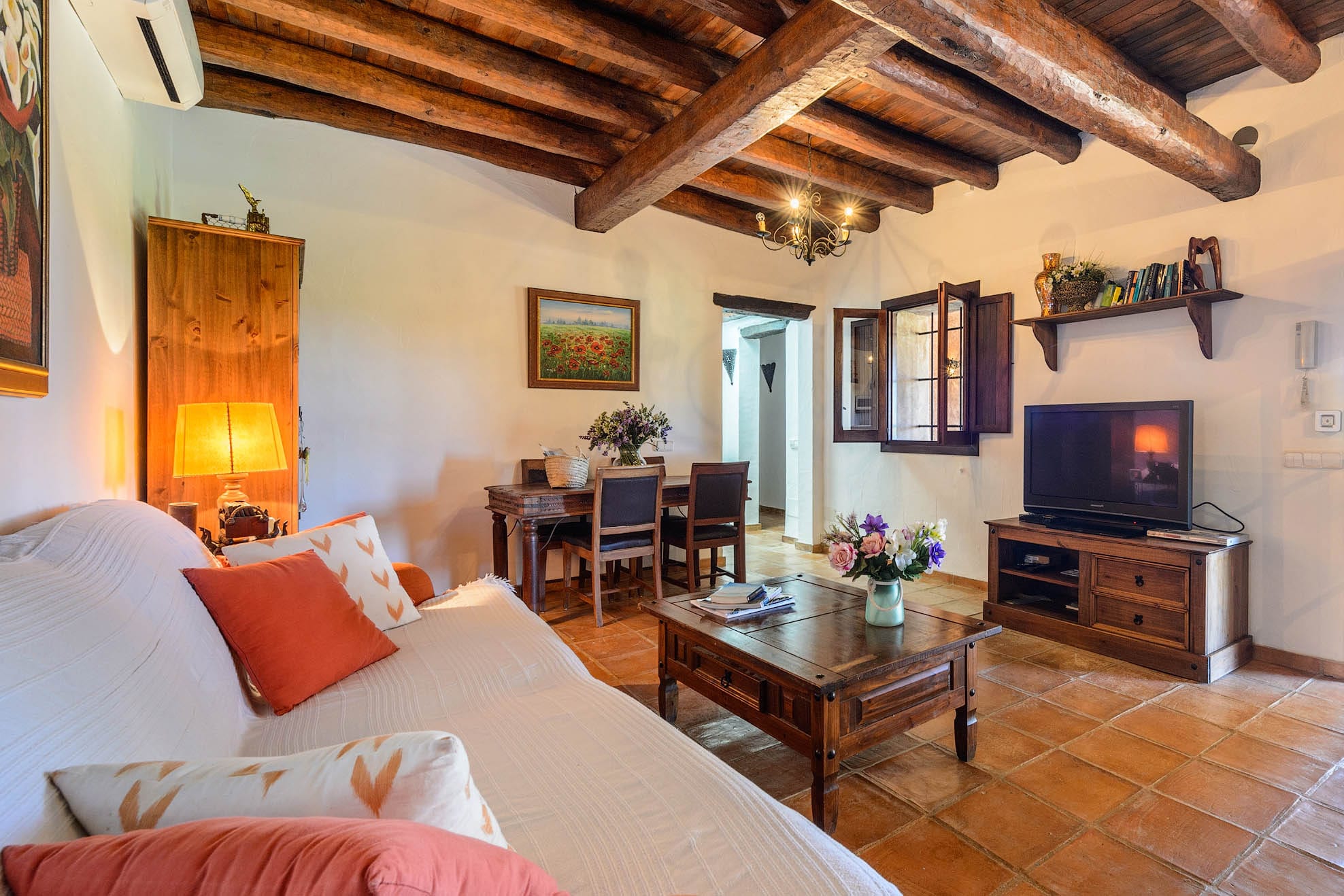 The house features a large living with dining space, air conditioning, and a fully equipped open kitchen.