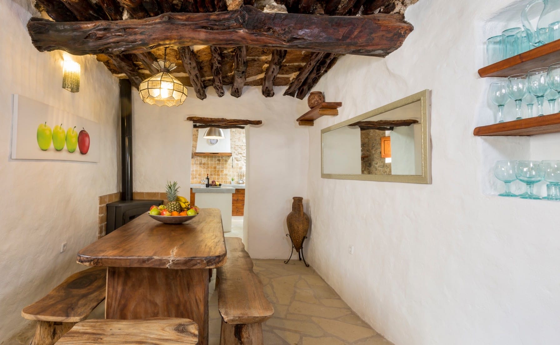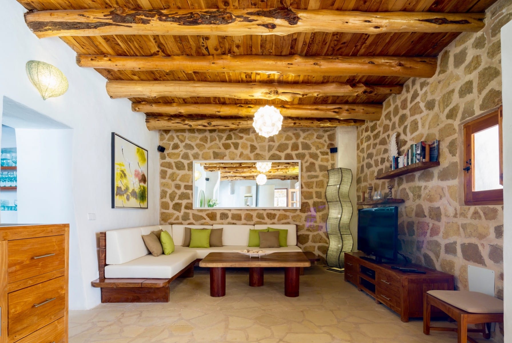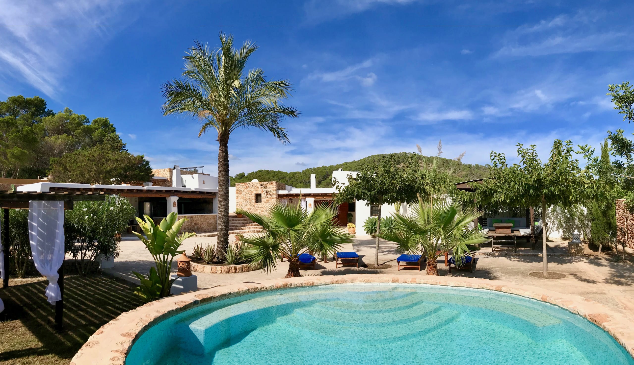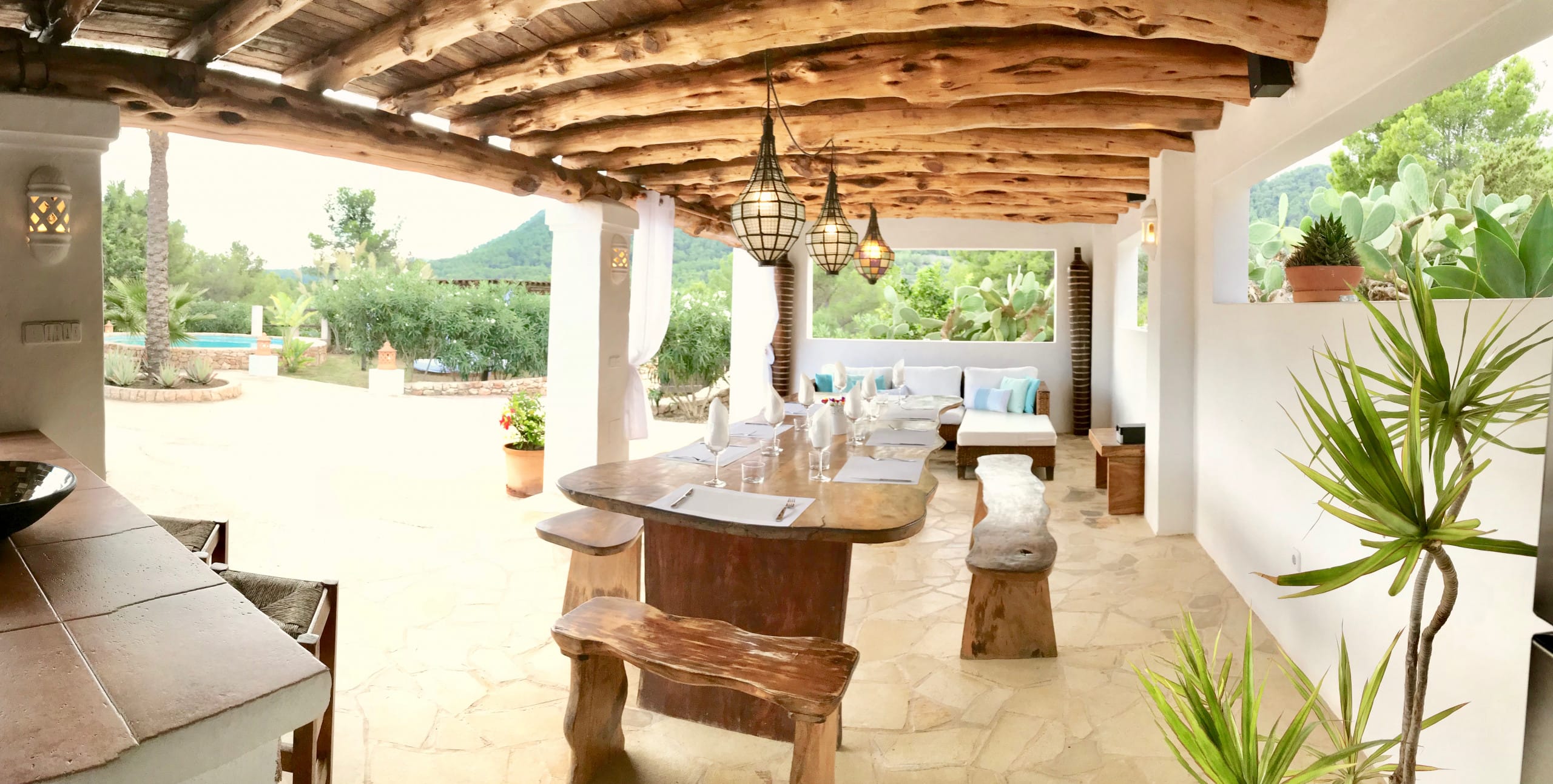 It has been fully renovated in a traditional, rustic-style and it is surrounded by a wonderful garden, it also boasts a beautiful private swimming pool and porches for outdoor dining and chill out terraces. The position of the house and the close proximity to the village and beaches make this property the ideal place for an unforgettable Ibiza villa holiday. The lovely country-style kitchen has everything a family might need. There are exposed beams throughout the villa and the property is decorated in rustic style, without sacrificing the comfort of its guests.