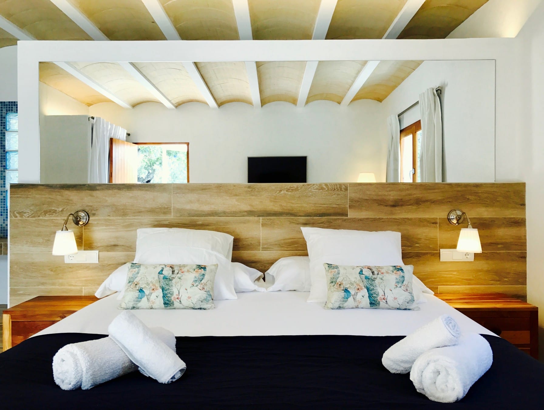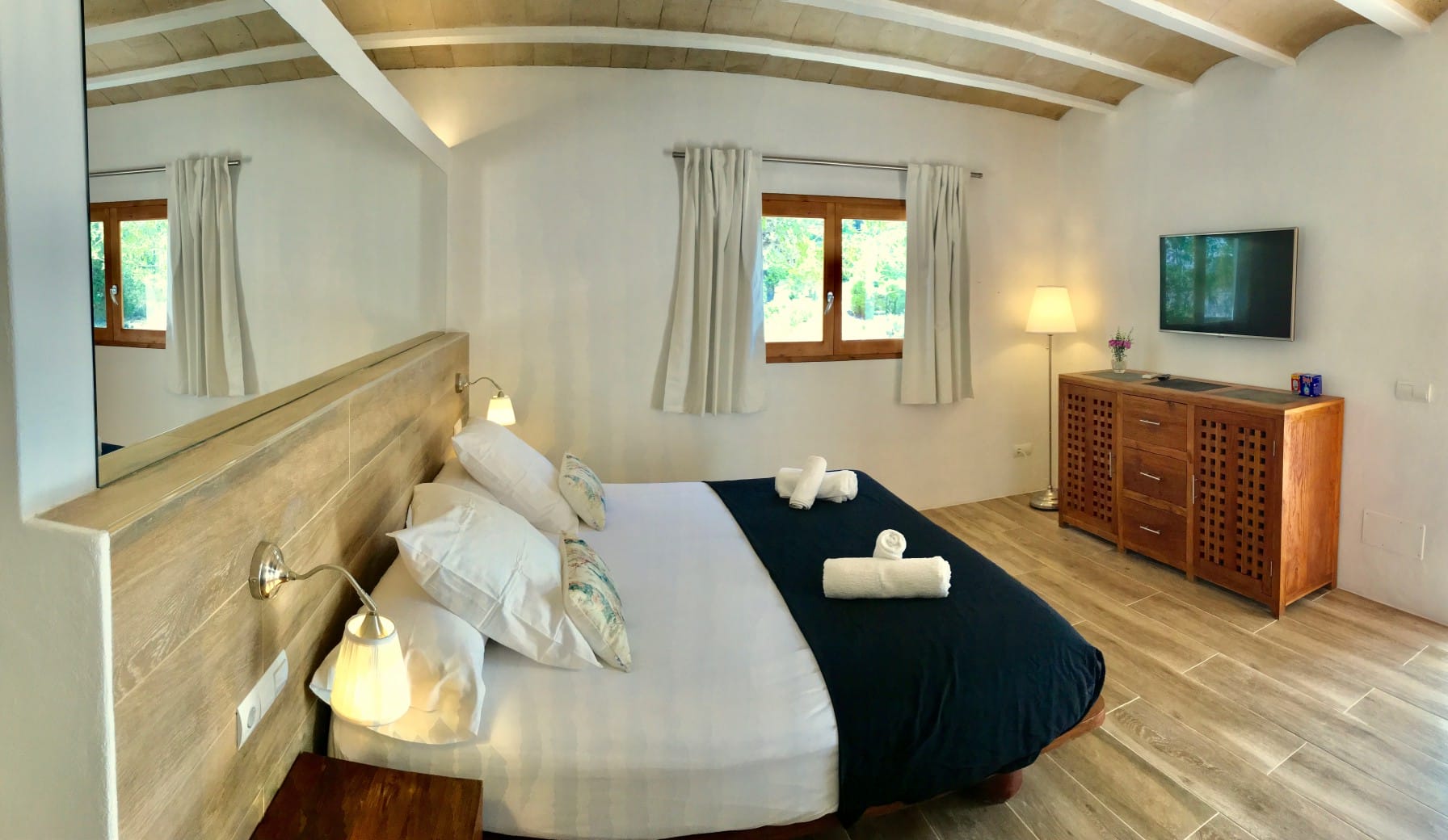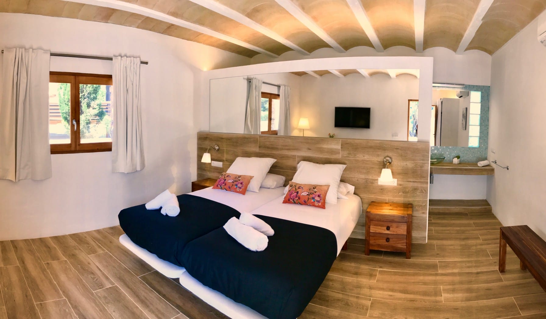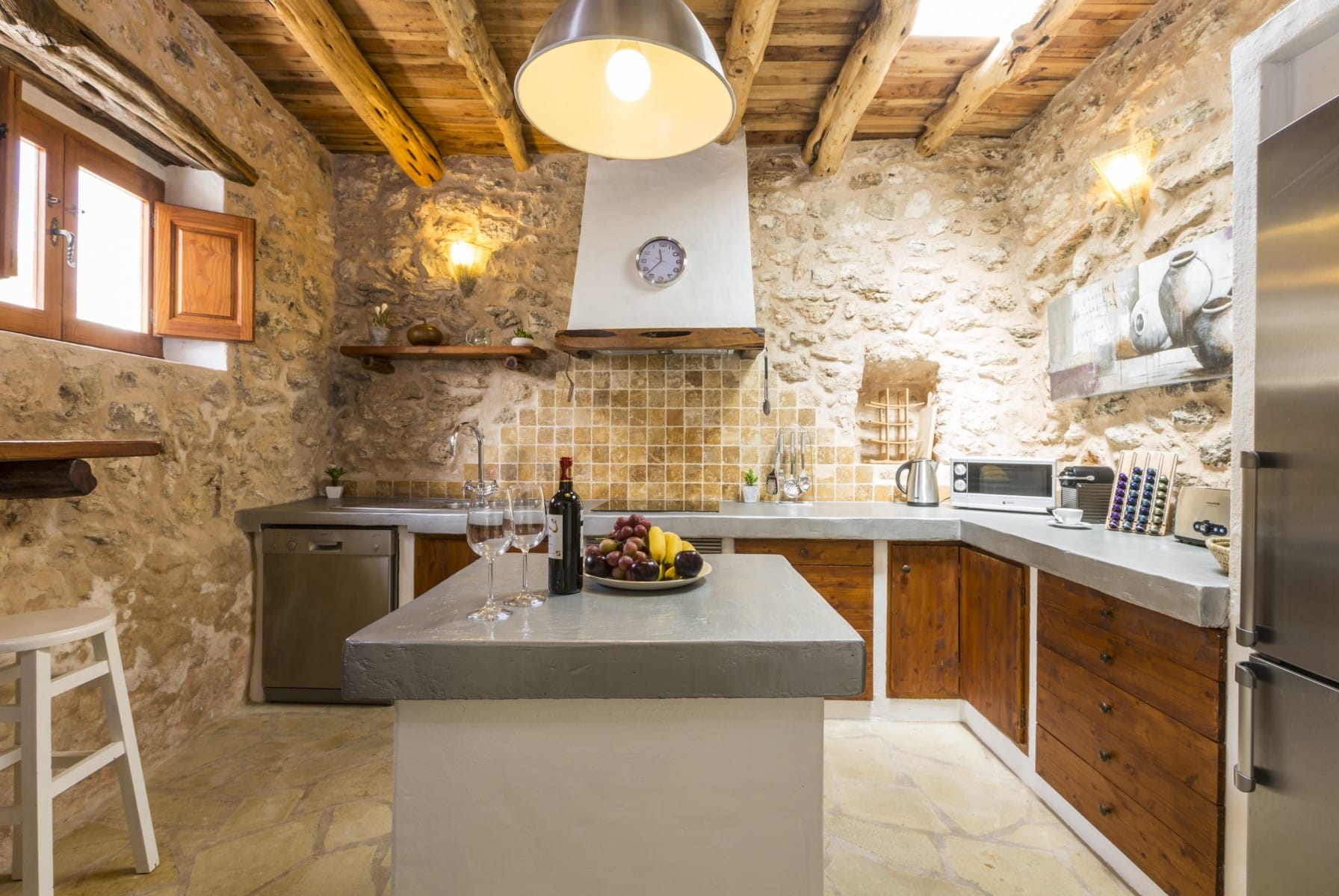 It has been fully renovated in a traditional, rustic-style and it is surrounded by a wonderful garden, it also boasts a beautiful private swimming pool and porches for outdoor dining and chill out terraces. The position of the house and the close proximity to the village and beaches make this property the ideal place for an unforgettable Ibiza villa holiday. The lovely country-style kitchen has everything a family might need. There are exposed beams throughout the villa and the property is decorated in rustic style, without sacrificing the comfort of its guests.