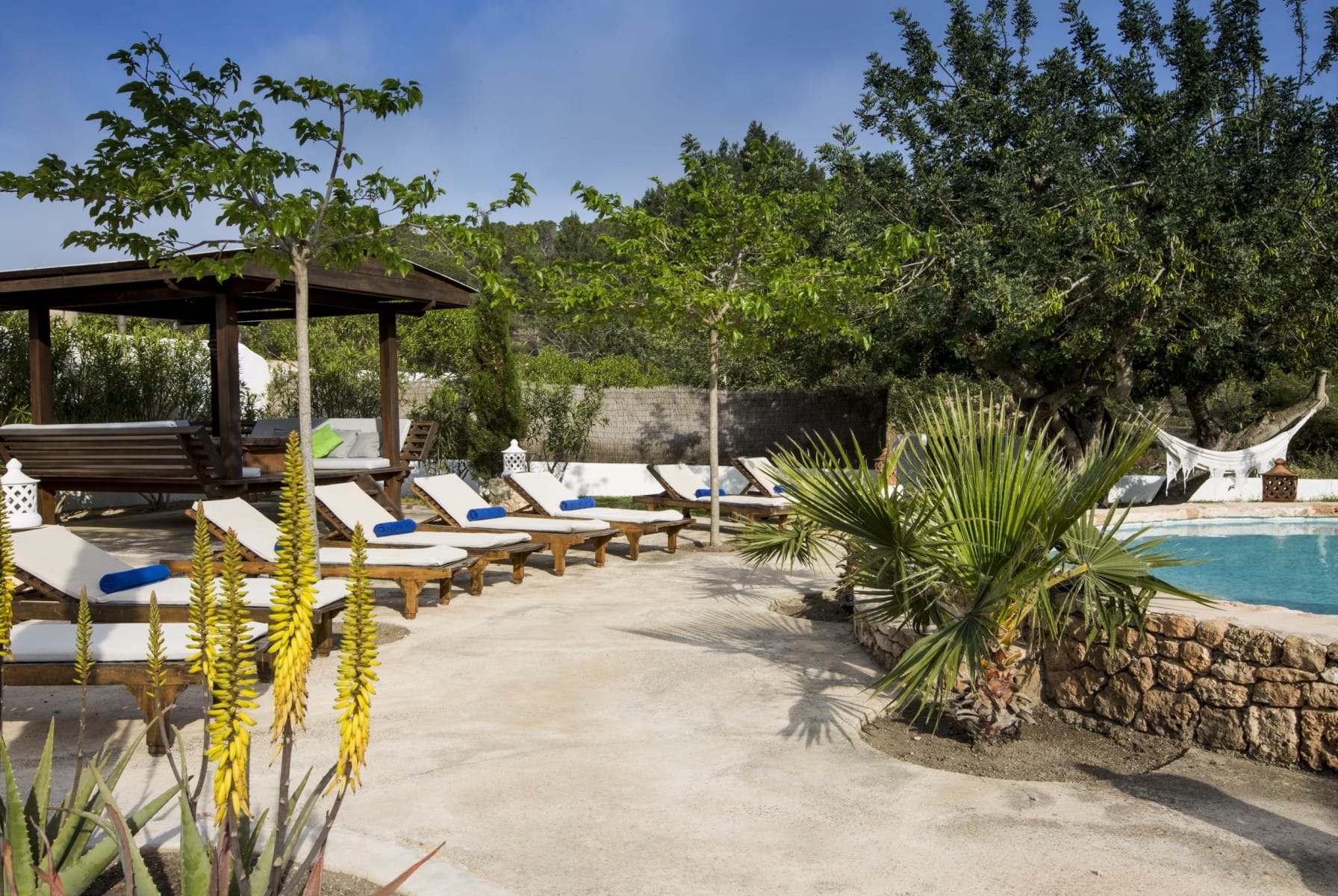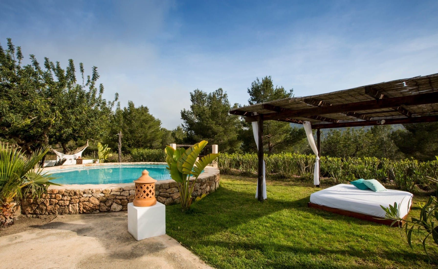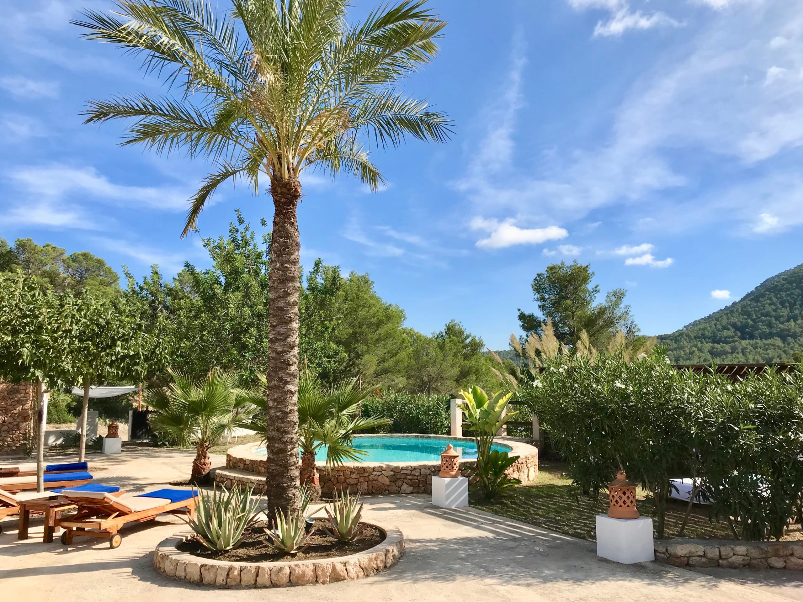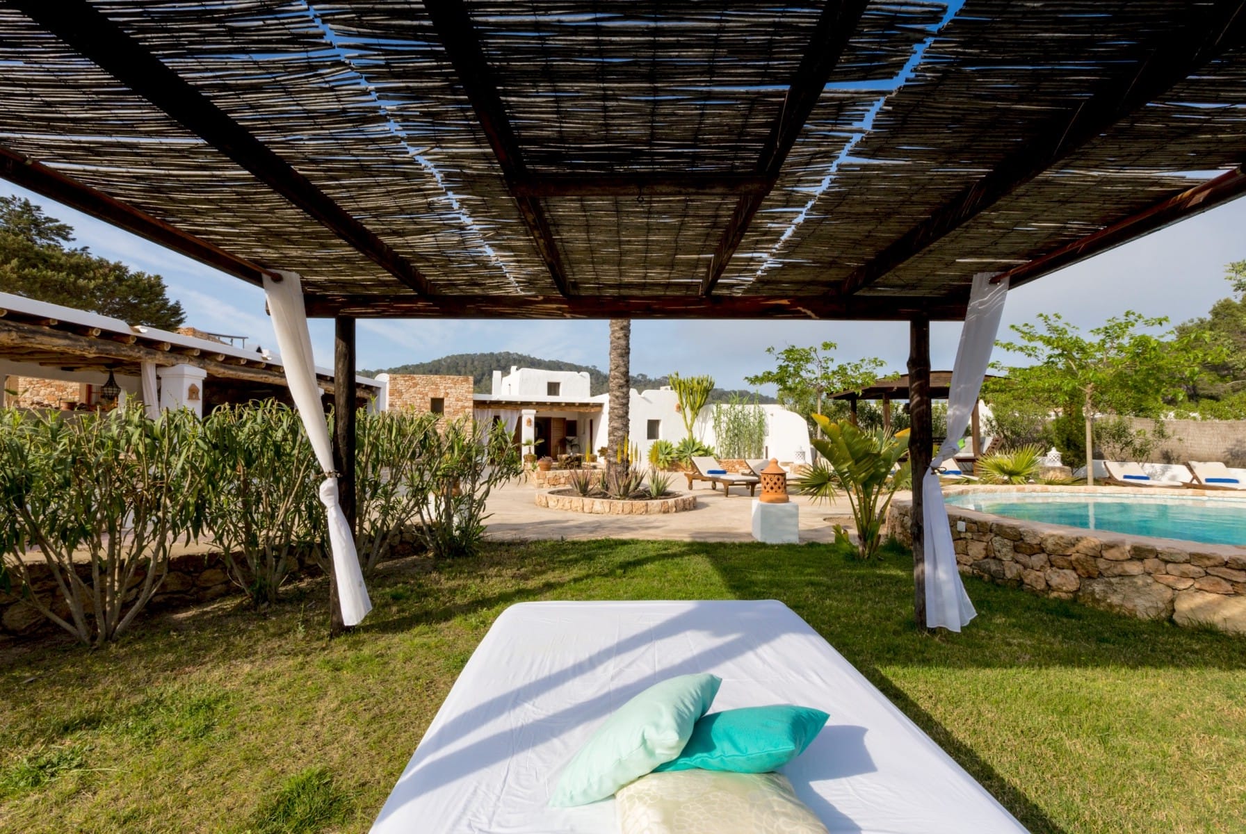This traditional Finca in Ibiza for rent is located just minutes drive to the village of San José, has a large garden with swimming pool and beautiful countryside views.