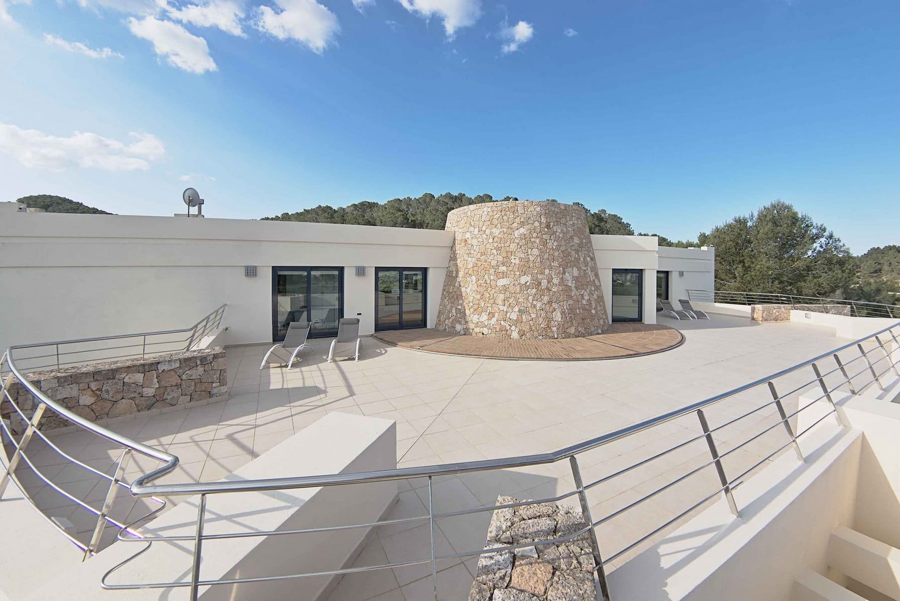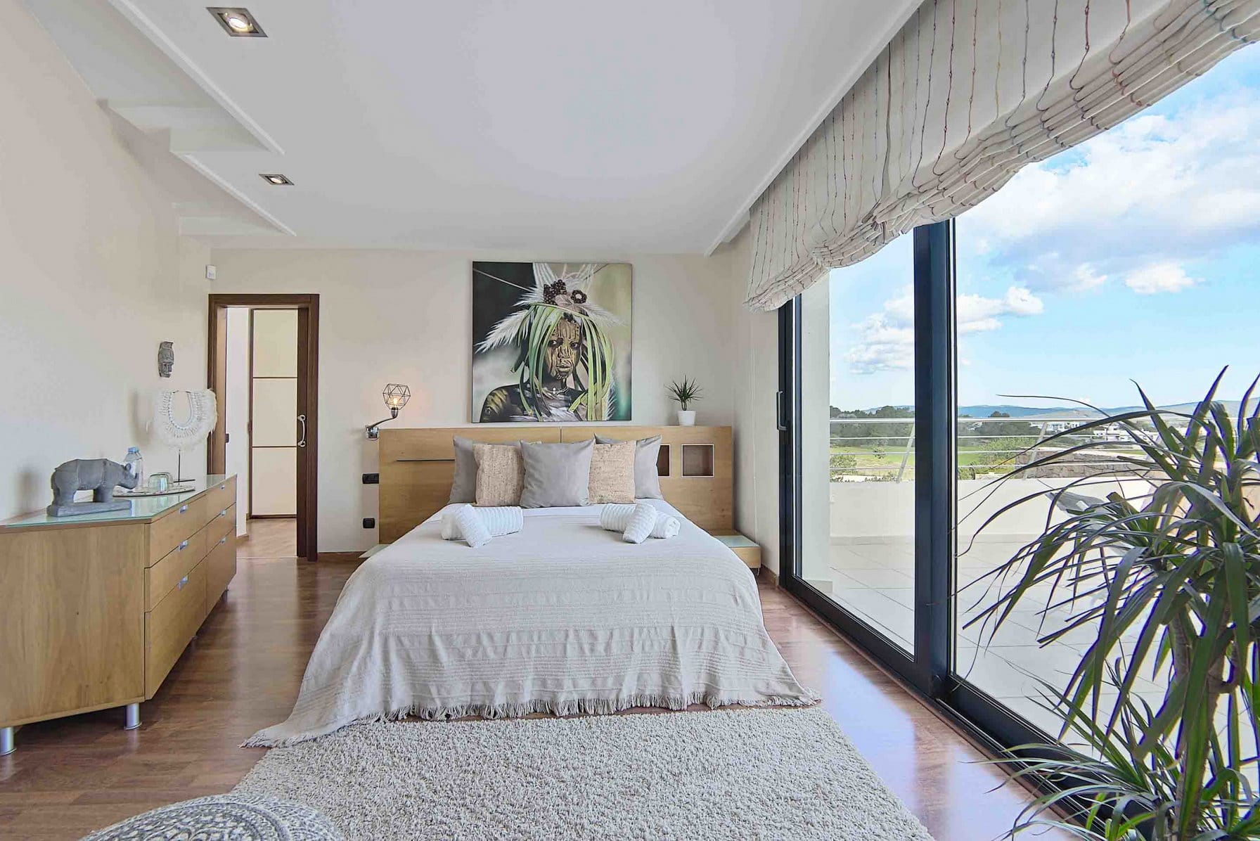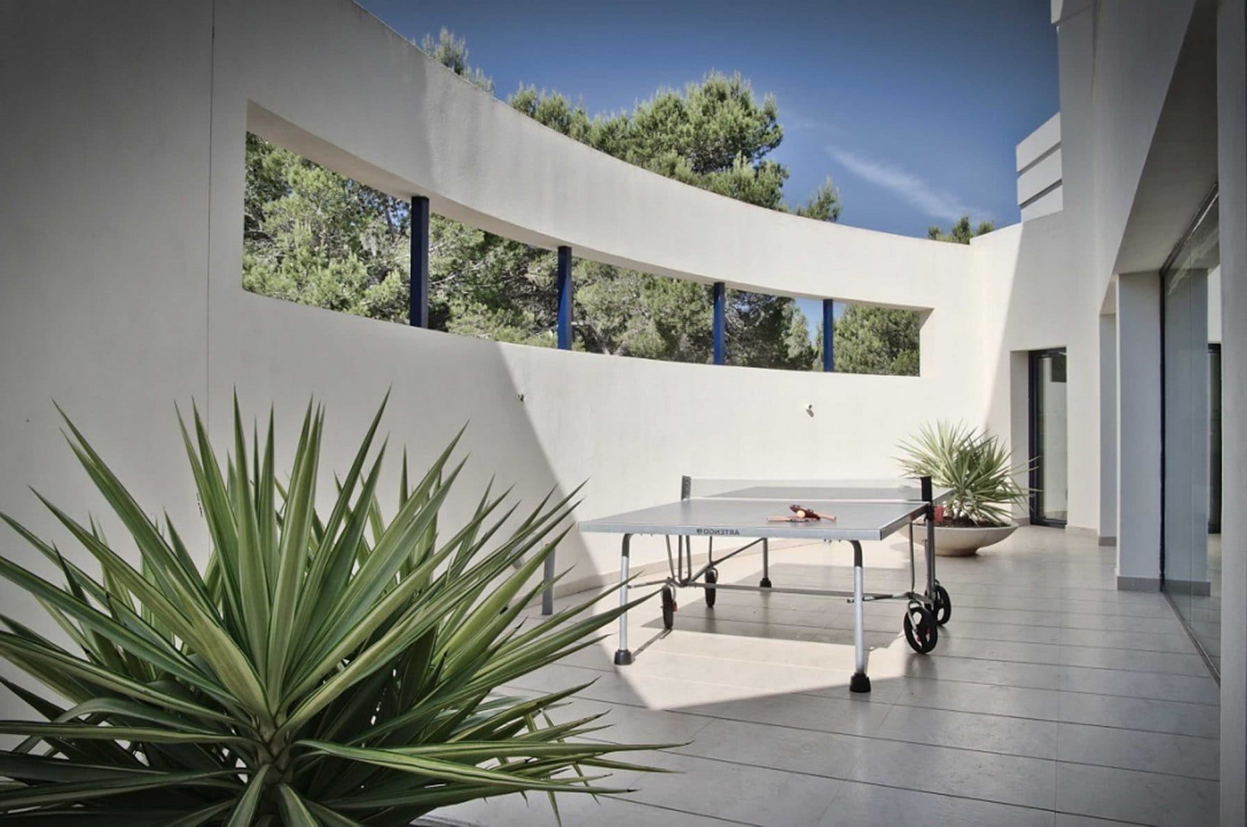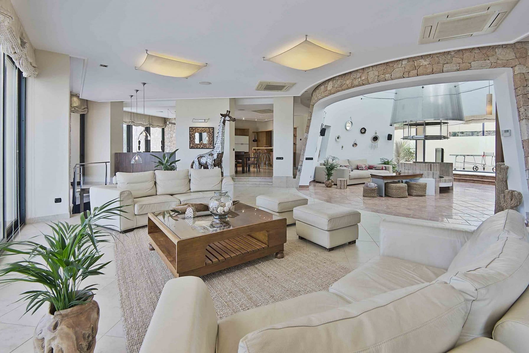 Inside, it offers 4 large bedrooms and ensuite bathrooms. The large windows and glass doors make this luxury Ibiza villa very bright.