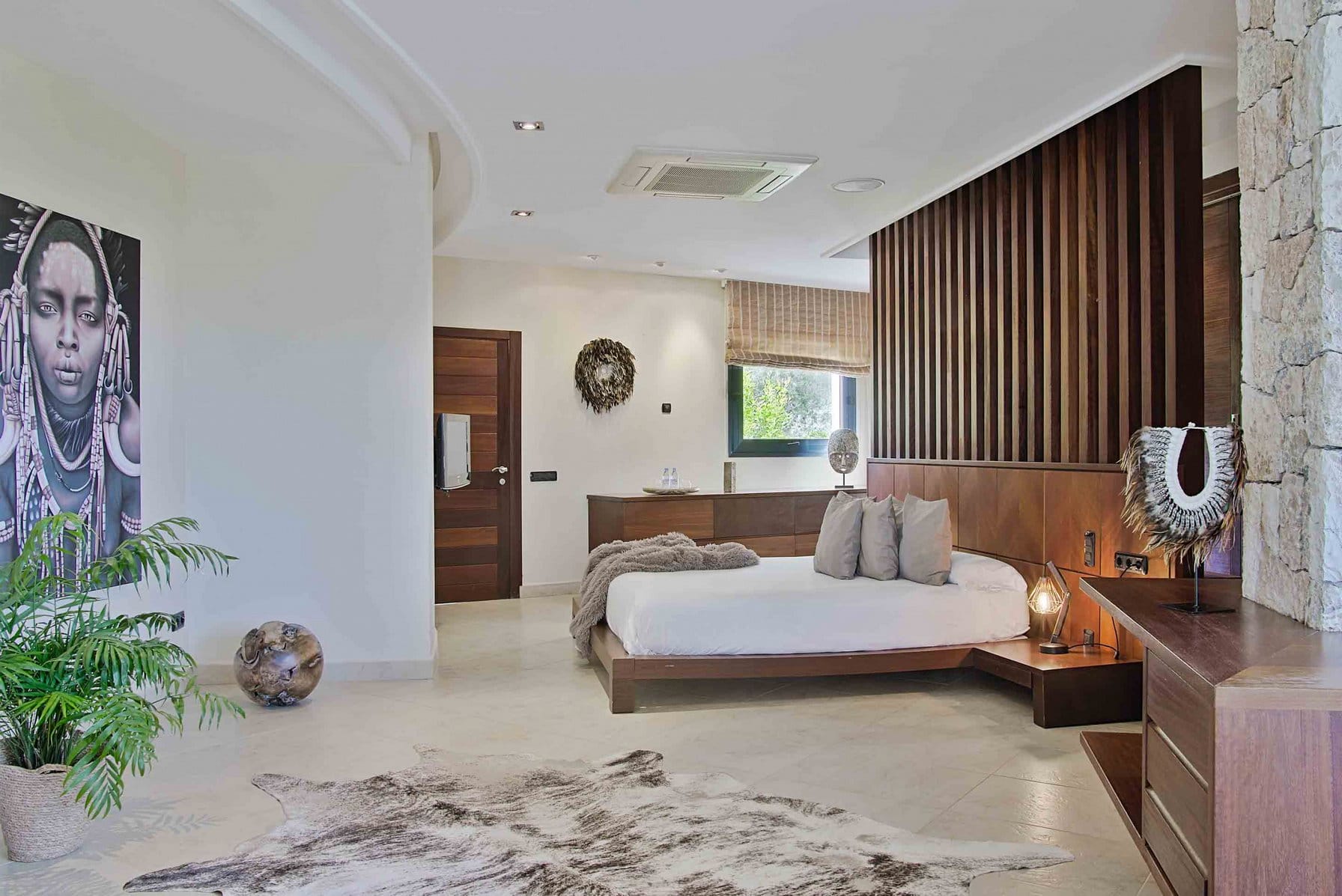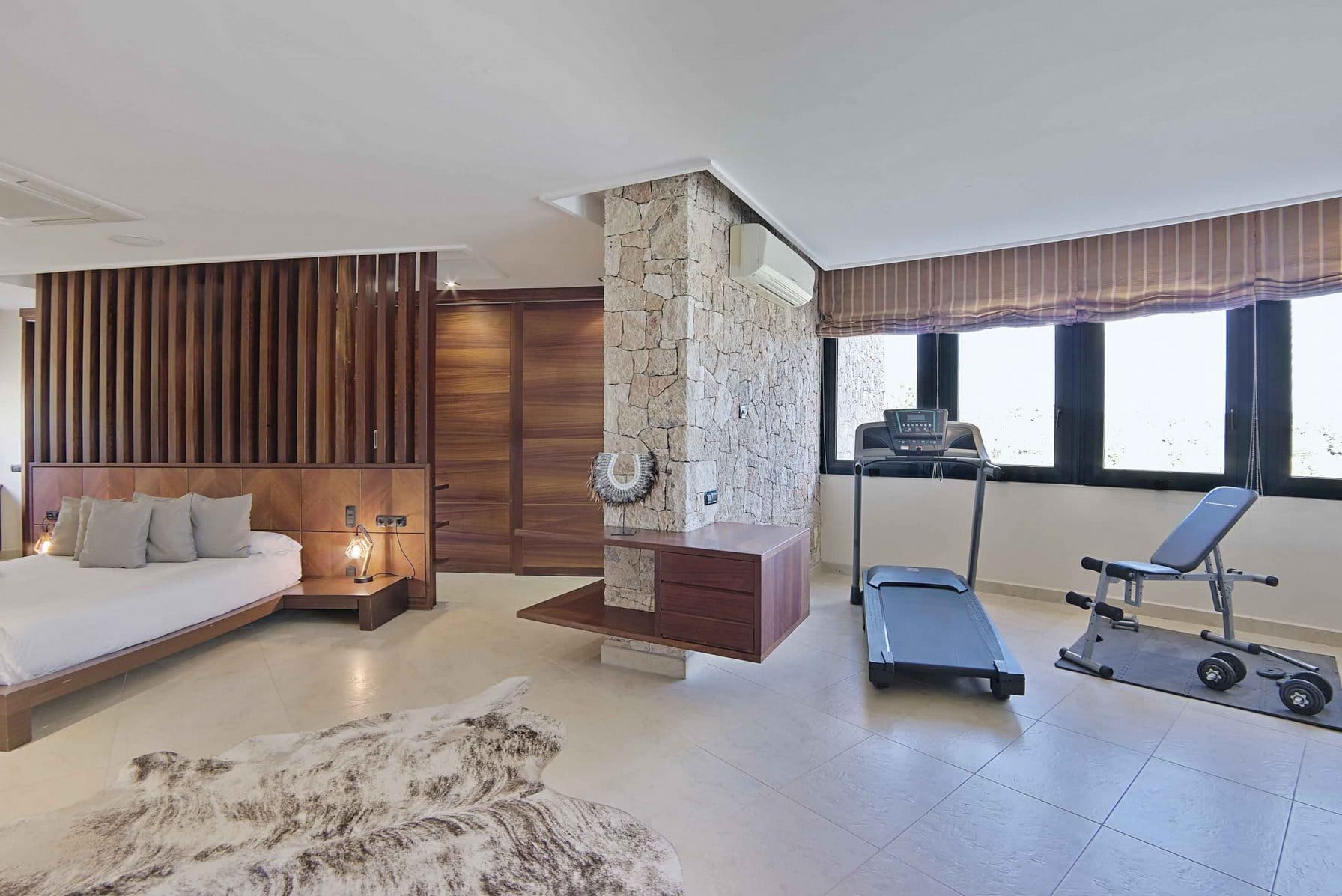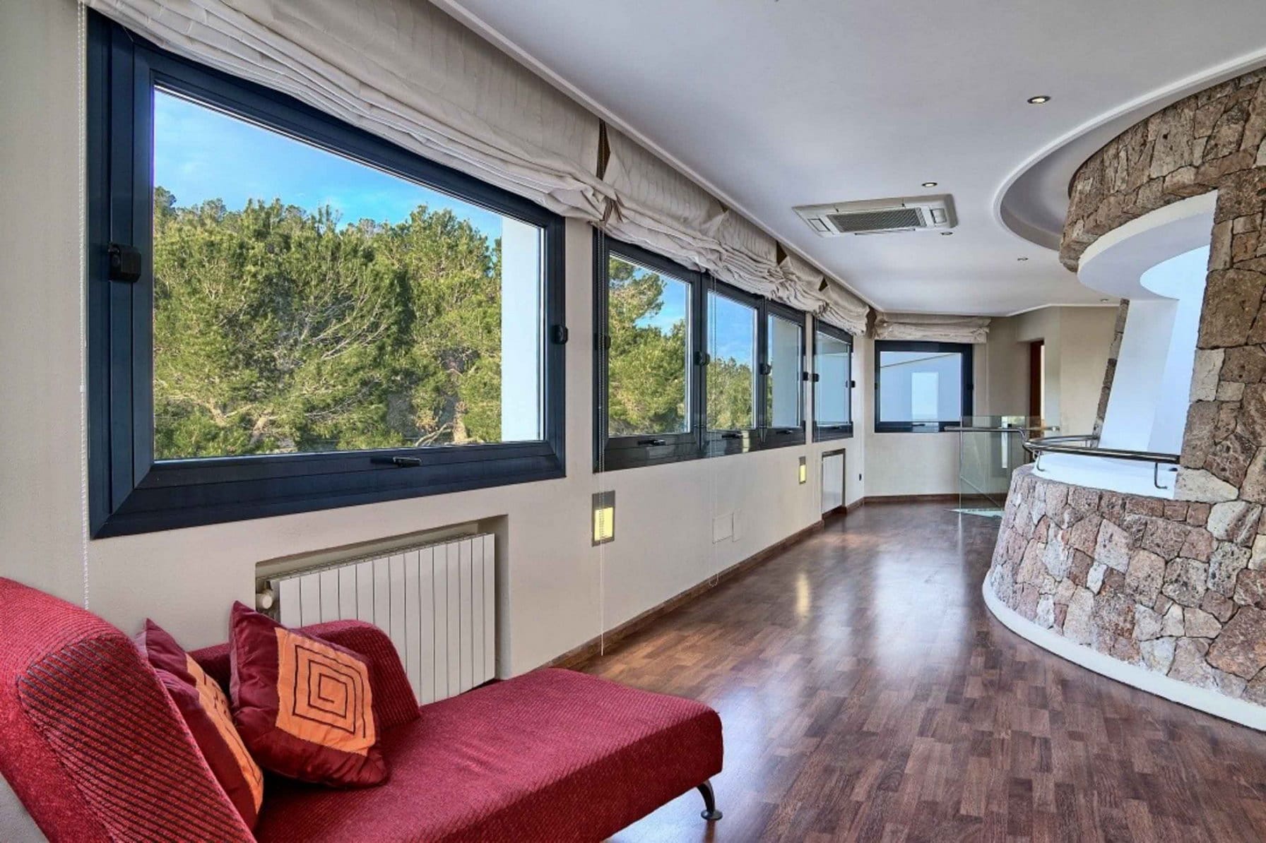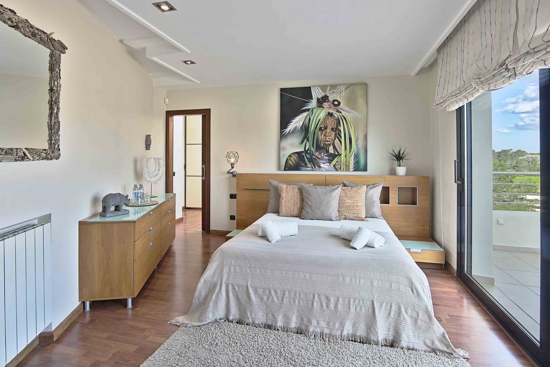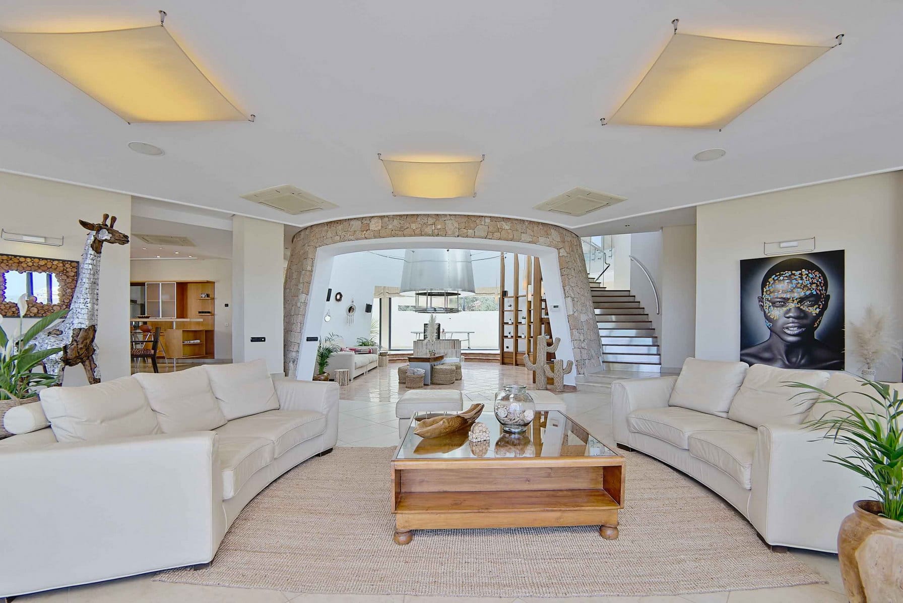 Inside, it offers 4 large bedrooms and ensuite bathrooms. The large windows and glass doors make this luxury Ibiza villa very bright.