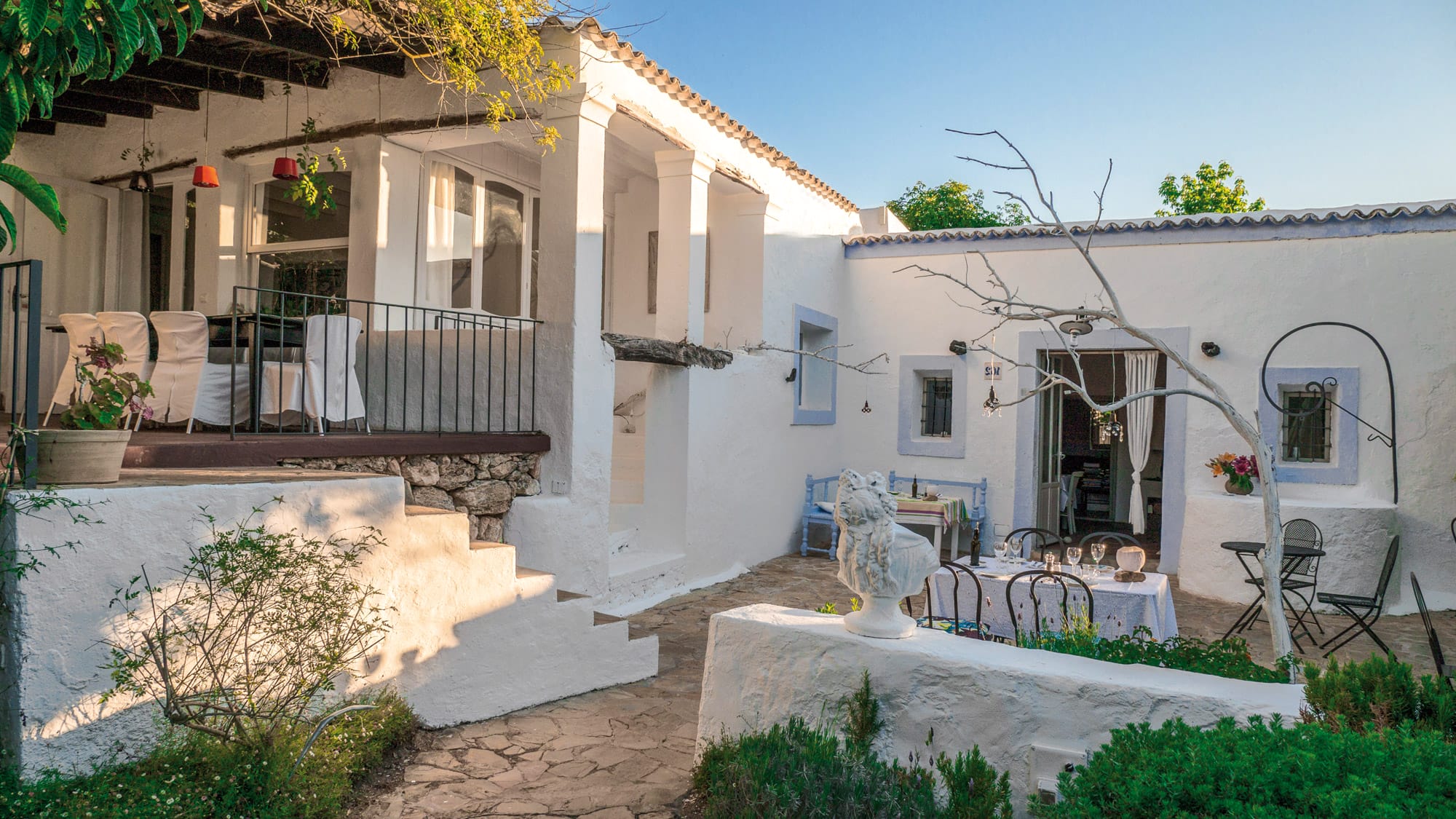Located on a hill from which a plain full of crops can be seen, this old farm with whitewashed walls and indigo windows converted into