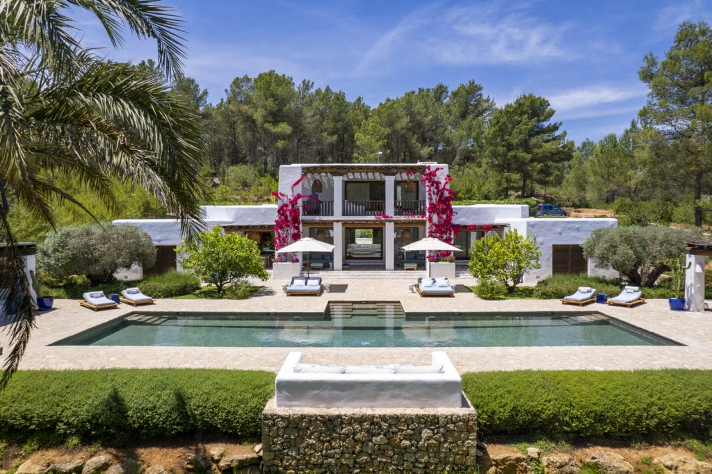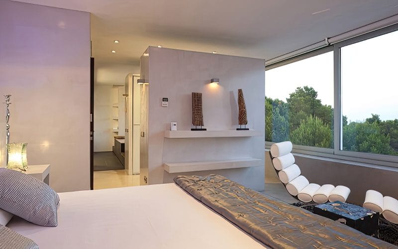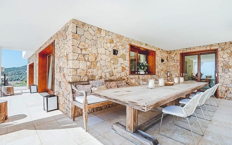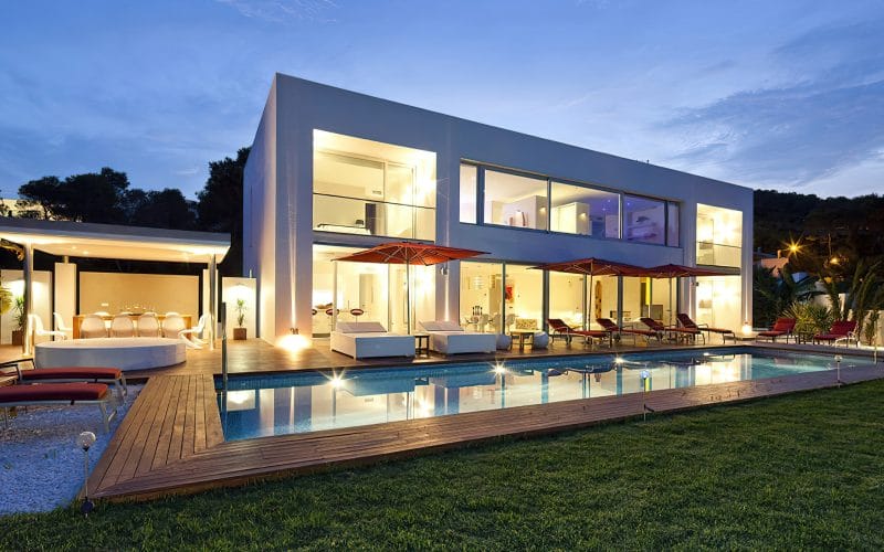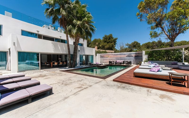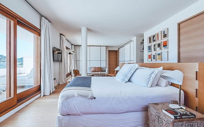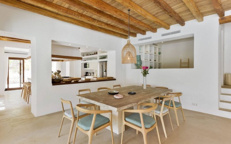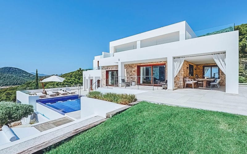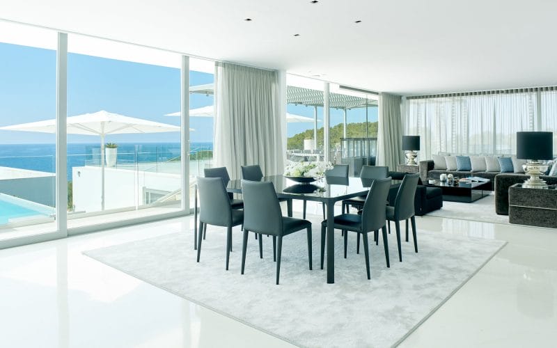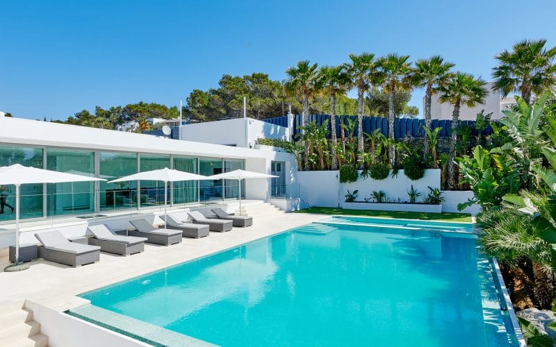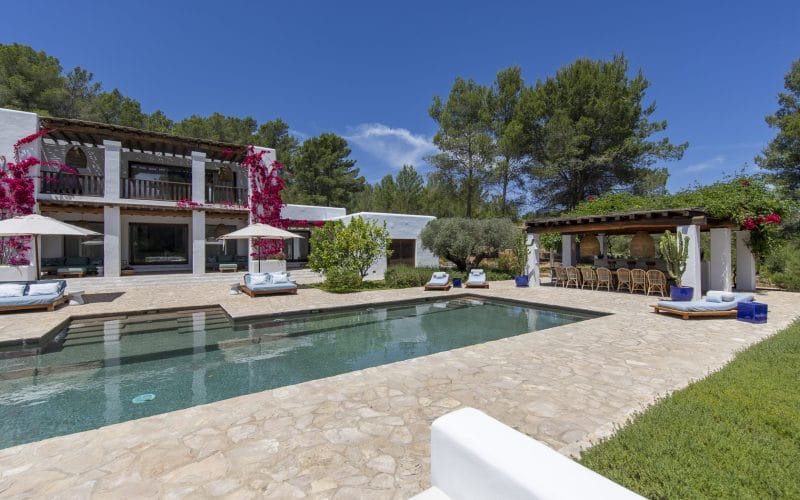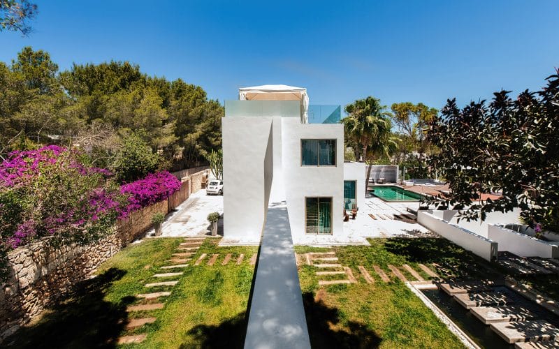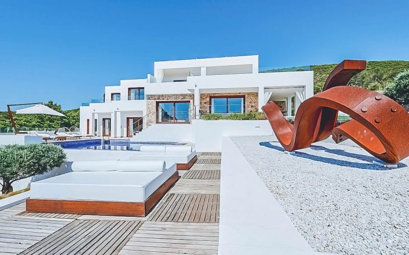 Splendid 340 m2 villa situated on a 1,700 m2 lot that is exquisitely appointed and appointed. Five of the accommodations feature private restrooms. In close proximity to Es Cubells, Es Torrent, and Cala Jondal beaches. Stunning in design, this minimalist