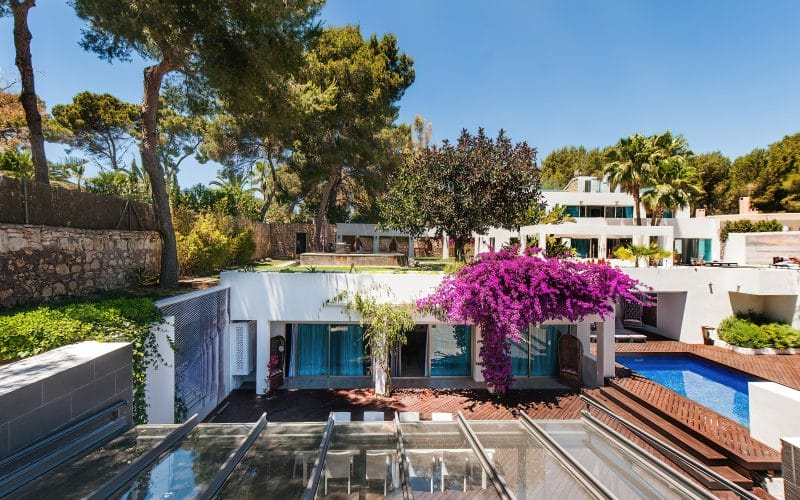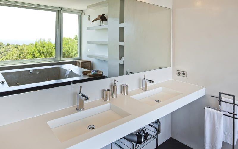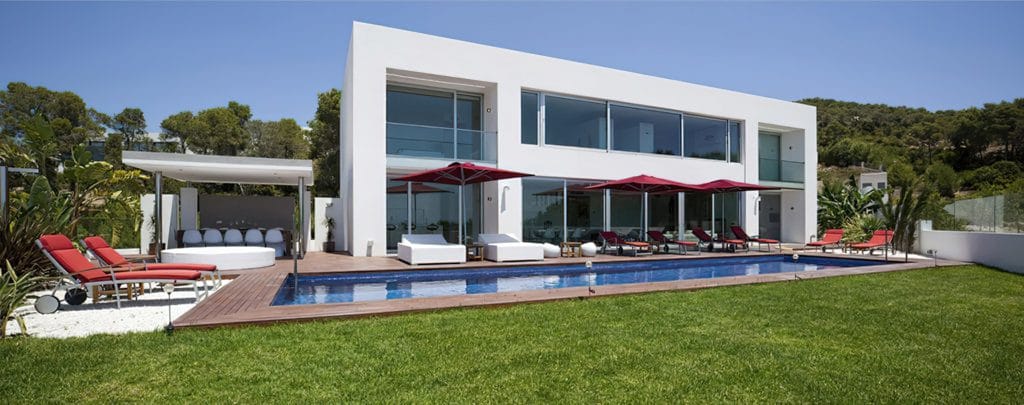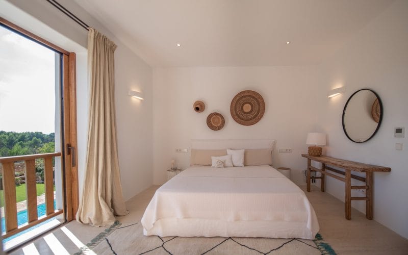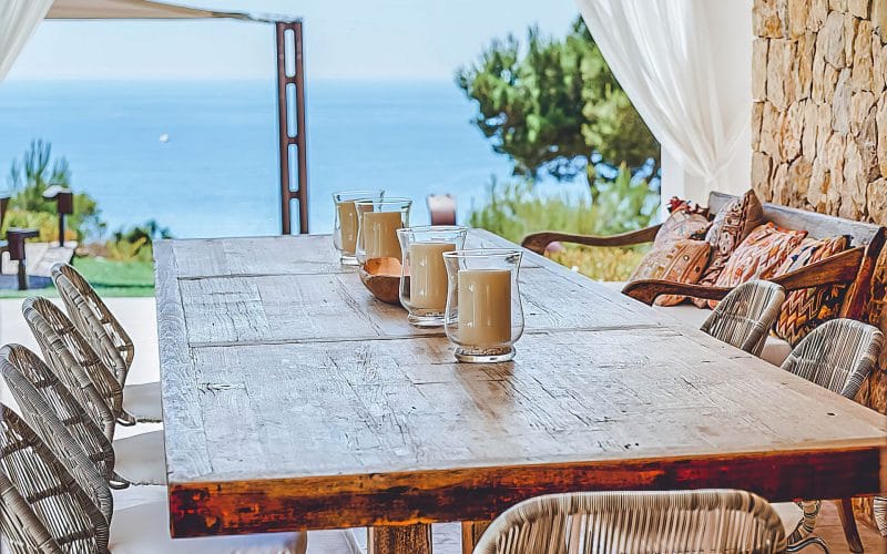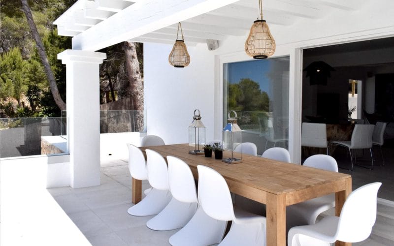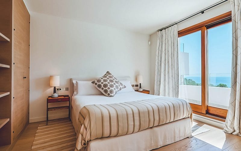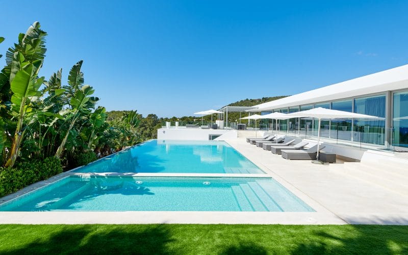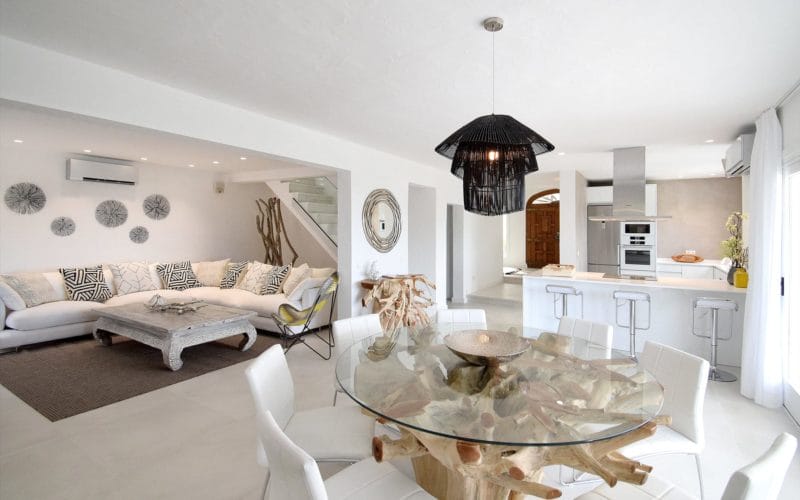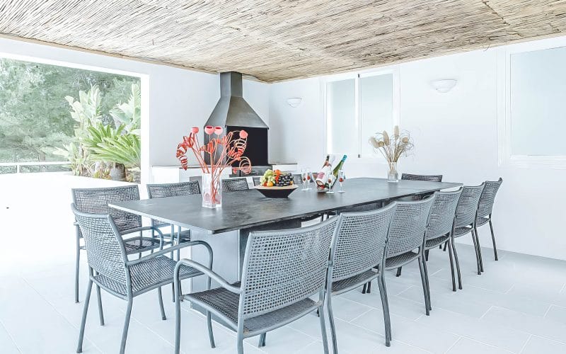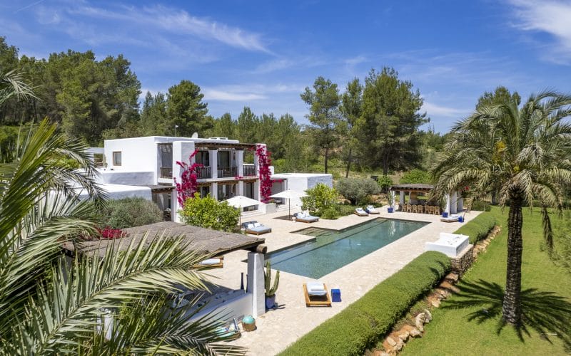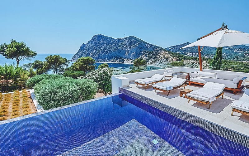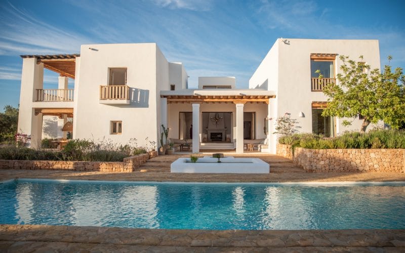 Splendid 340 m2 villa situated on a 1,700 m2 lot that is exquisitely appointed and appointed. Five of the accommodations feature private restrooms. In close proximity to Es Cubells, Es Torrent, and Cala Jondal beaches. Stunning in design, this minimalist
